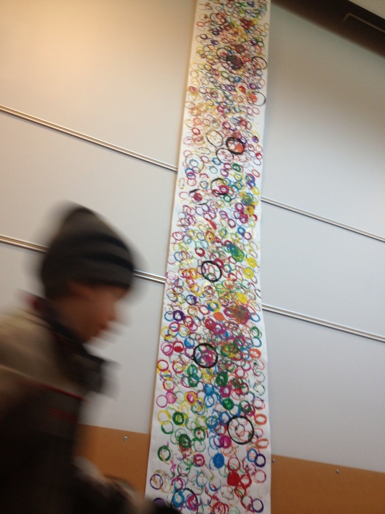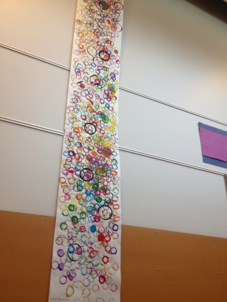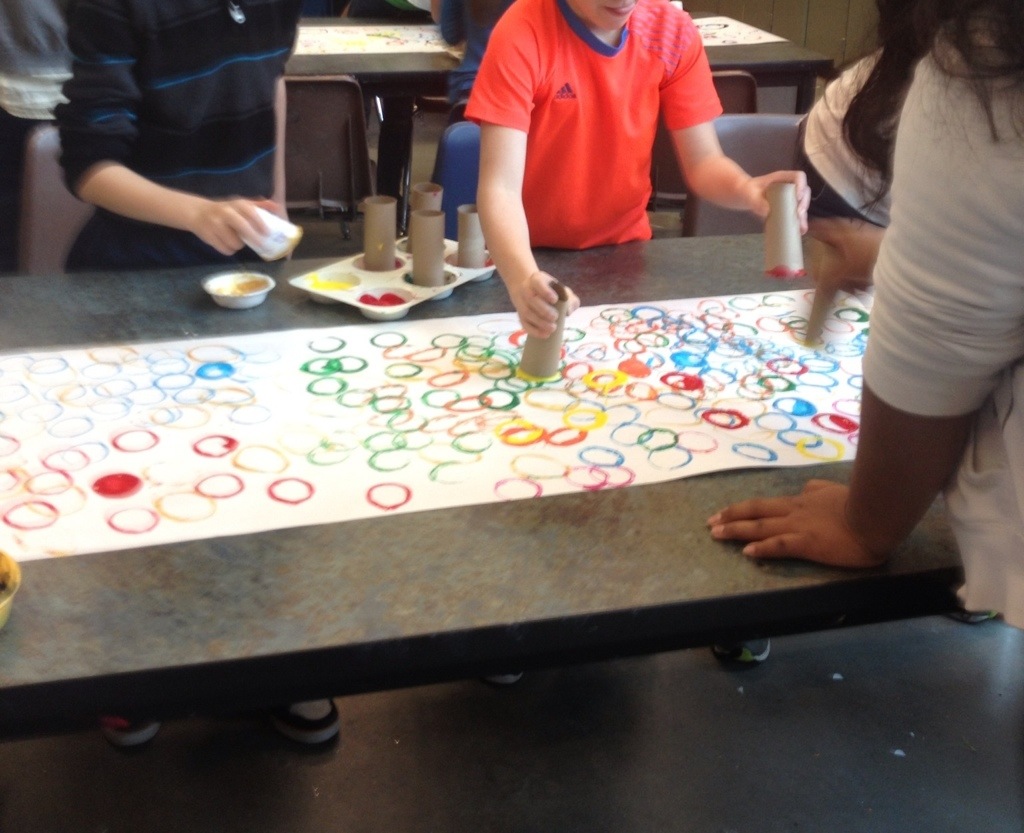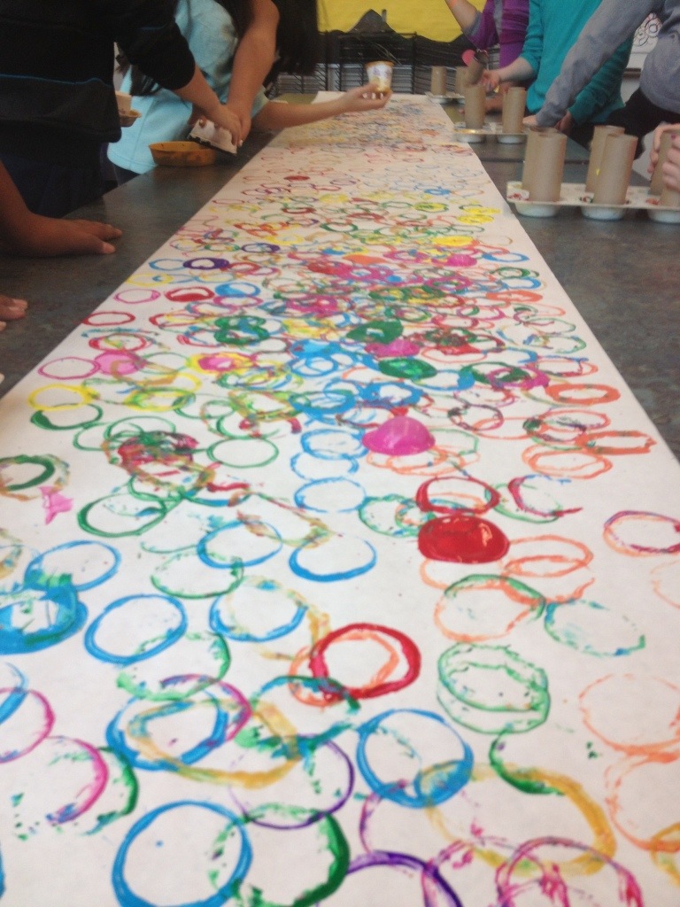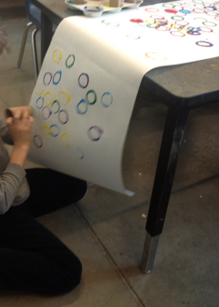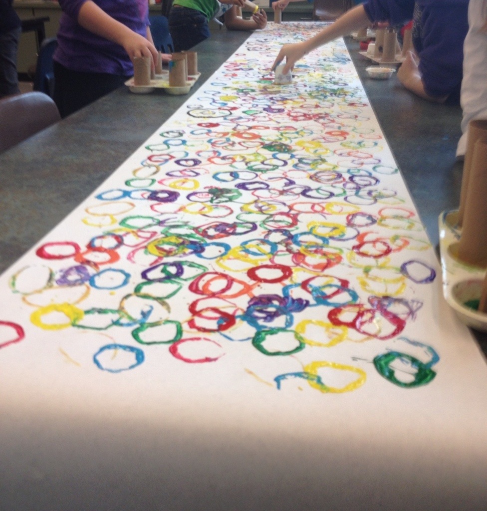 I talked to the kids about modern artists. They’re alive! And…. They don’t always use brushes and paper. Ani Hoover uses spray paint, PVC pipes, templates and makes her own “paper”.