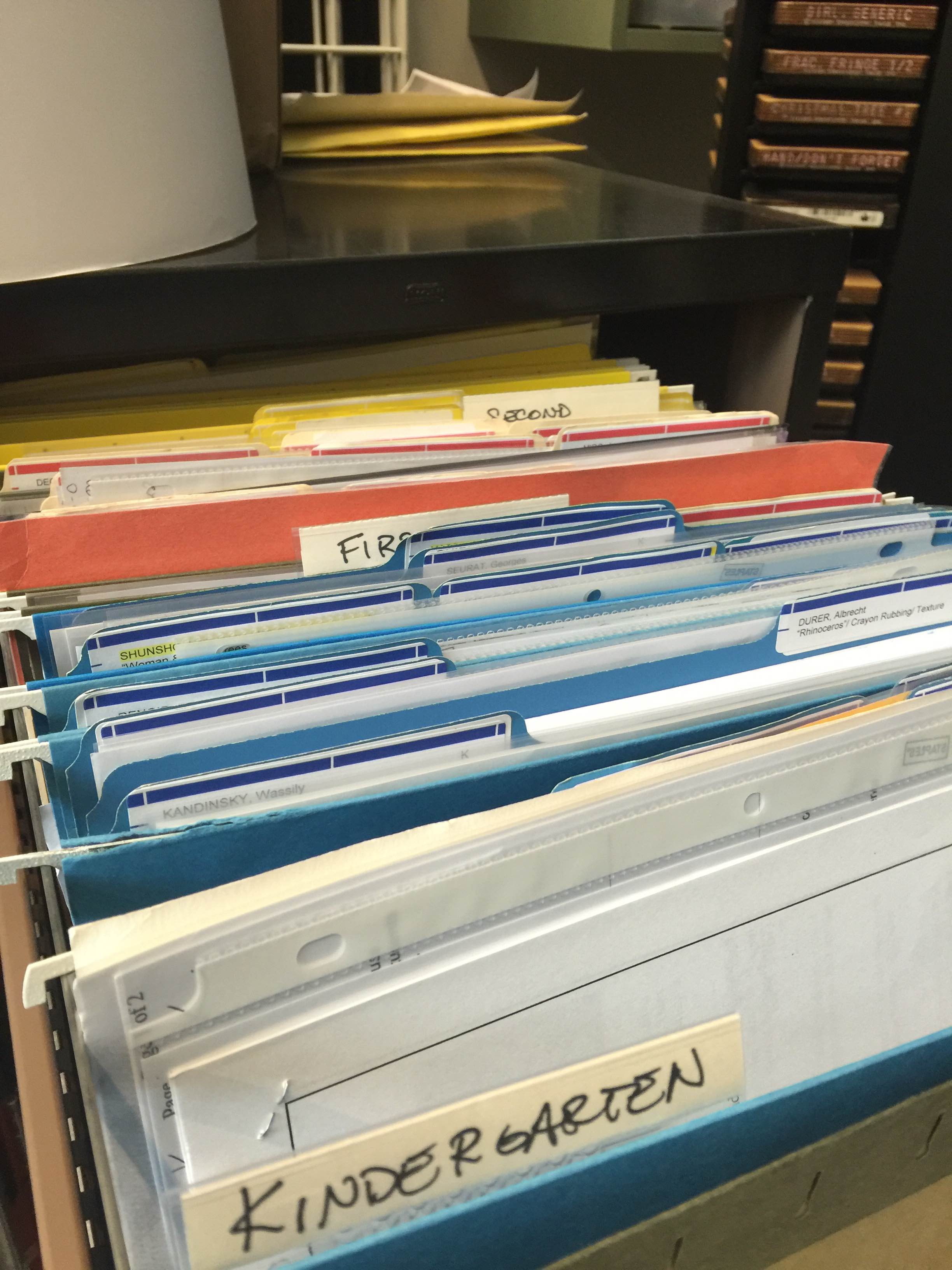 There is a list of lesson by grade sitting on top of the cabinet so you can quickly peruse the projects and pull a file. There will soon be a binder full of samples of each (most) lessons so that if you like, you can look in the binder, see something you like and pull the file.
