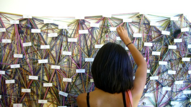 A. I work in many mediums and styles, but this is my favorite piece so far. Identity Tapestry is a Participatory Installation. Each participant selects a color of yarn (out of 300 some uniquely dyed skeins) to represent them. They then wrap the yarn around the identity statements they feel are part of their identity. Some of these are simple “I am a woman”, “music moves me” and some more hard-hitting “I have fought in a war”, “I have seen a someone dying”, and even “I have been raped”. As more and more people overlay the strands of their lives the interconnections and common human experiences become visible, forming a Tapestry of human identity.